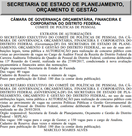 O extrato da autorização pelo Comitê de Políticas Públicas de Pessoal foi publicado, por sua vez, no Diário Oficial do DF de 04 de abril. Segundo o comunicado, o prazo para lançamento do edital é de 180 dias.
